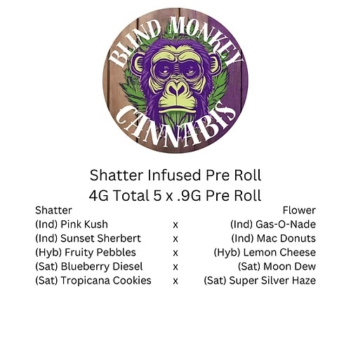 Crafted in small batches, these pre-rolls use premium flower, never trim, and are delicately infused to maintain optimal potency, flavor, and burn. Blind Monkey Cannabis stands for quality, care, and consistency, delivering a true craft pre-roll experience that hits harder, tastes better, and burns smoother.