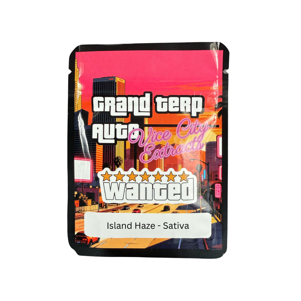 Escape to the tropics with GTA Vice City Extracts Shatter – Island Haze (Sativa). This golden, glass-like shatter delivers that signature clean snap with smooth, flavourful pulls packed with bright citrus, tropical fruit, and light herbal haze notes.